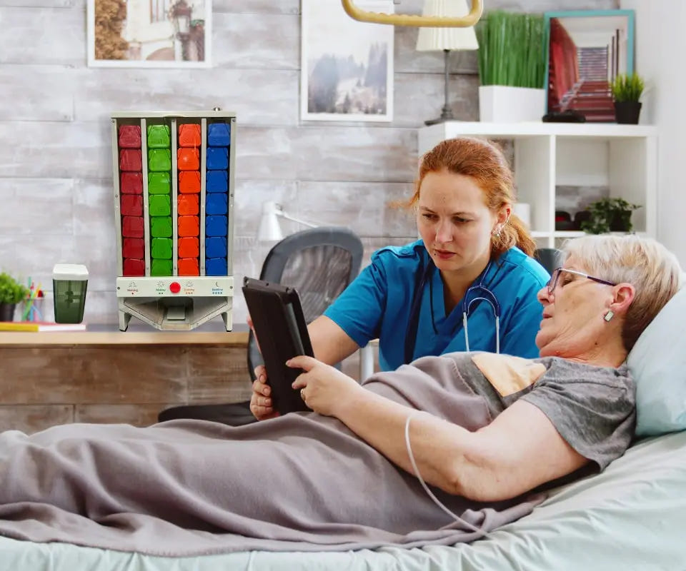 The ultimate medication management solution designed to bring peace of mind to those who need it most. With its innovative combination of tactile identification using "Bump Dots" for visually impaired users, automated scheduled dispensing, a monitoring system with SMS notifications to caregivers and multi-sensory notifications from the device, Time-Touch-Take reduces medication errors, enhancing safety and independence for low vision, blind, and elderly individuals.