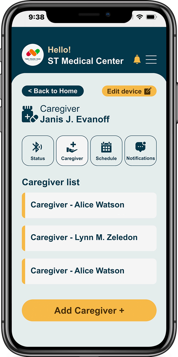Designate up to 3 caregivers for remote monitoring of the patient’s medication dispensing schedule. These caregivers will receive SMS notifications with updates to ensure that medications are taken on time, everytime.