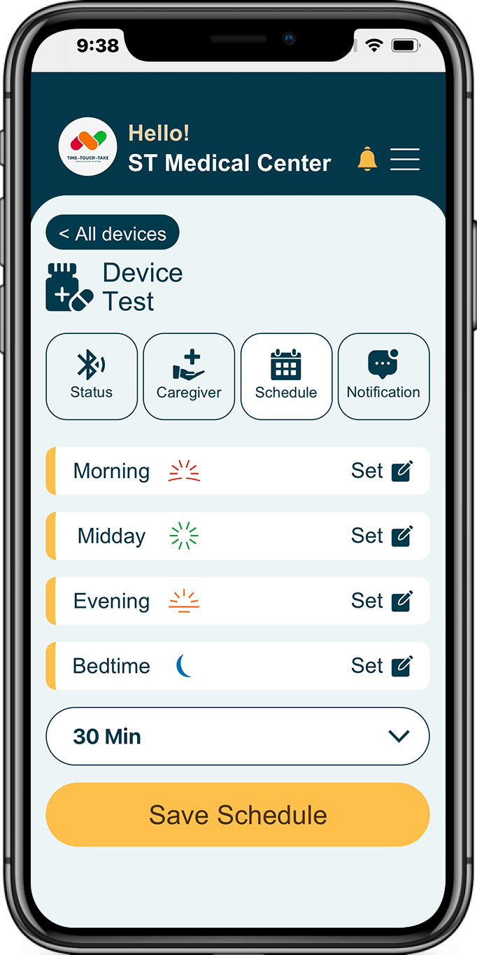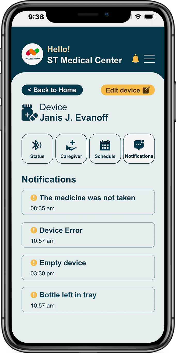 No need for a wifi connection to ensure that medications are dispensed on time. Our mobile app only requires a Bluetooth connection to set up your schedules and designate caregivers. After set-up, Time-Touch-Take can operate without an internet connection - dispensing medication on schedule and sending SMS alerts to caregivers as needed.